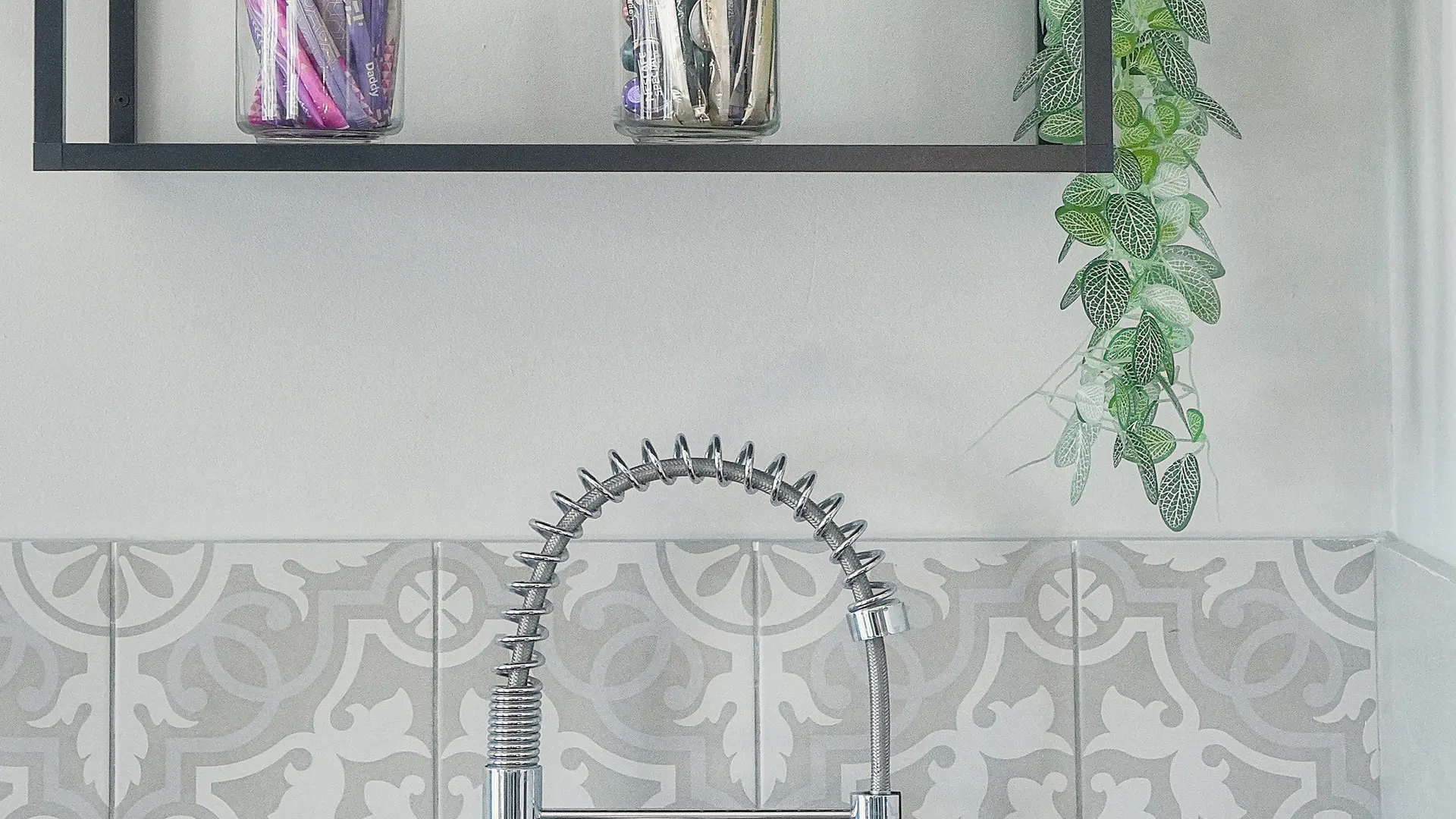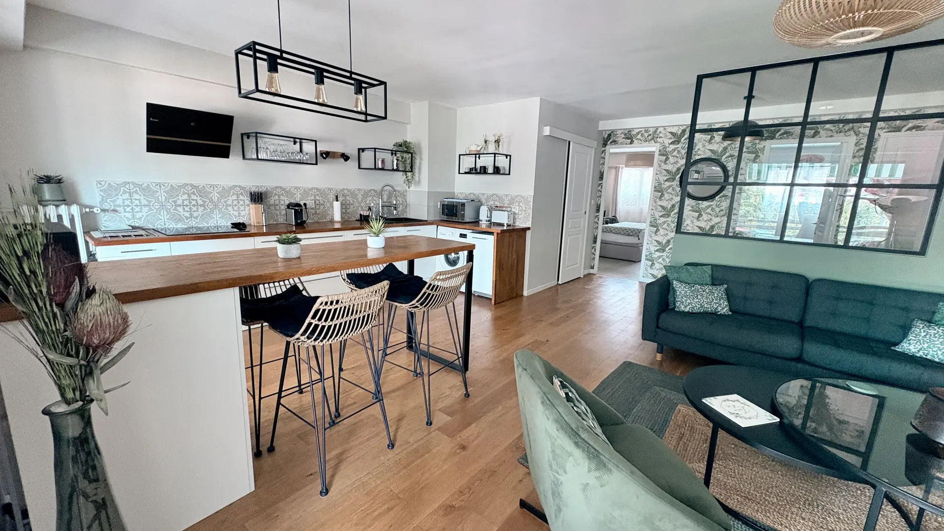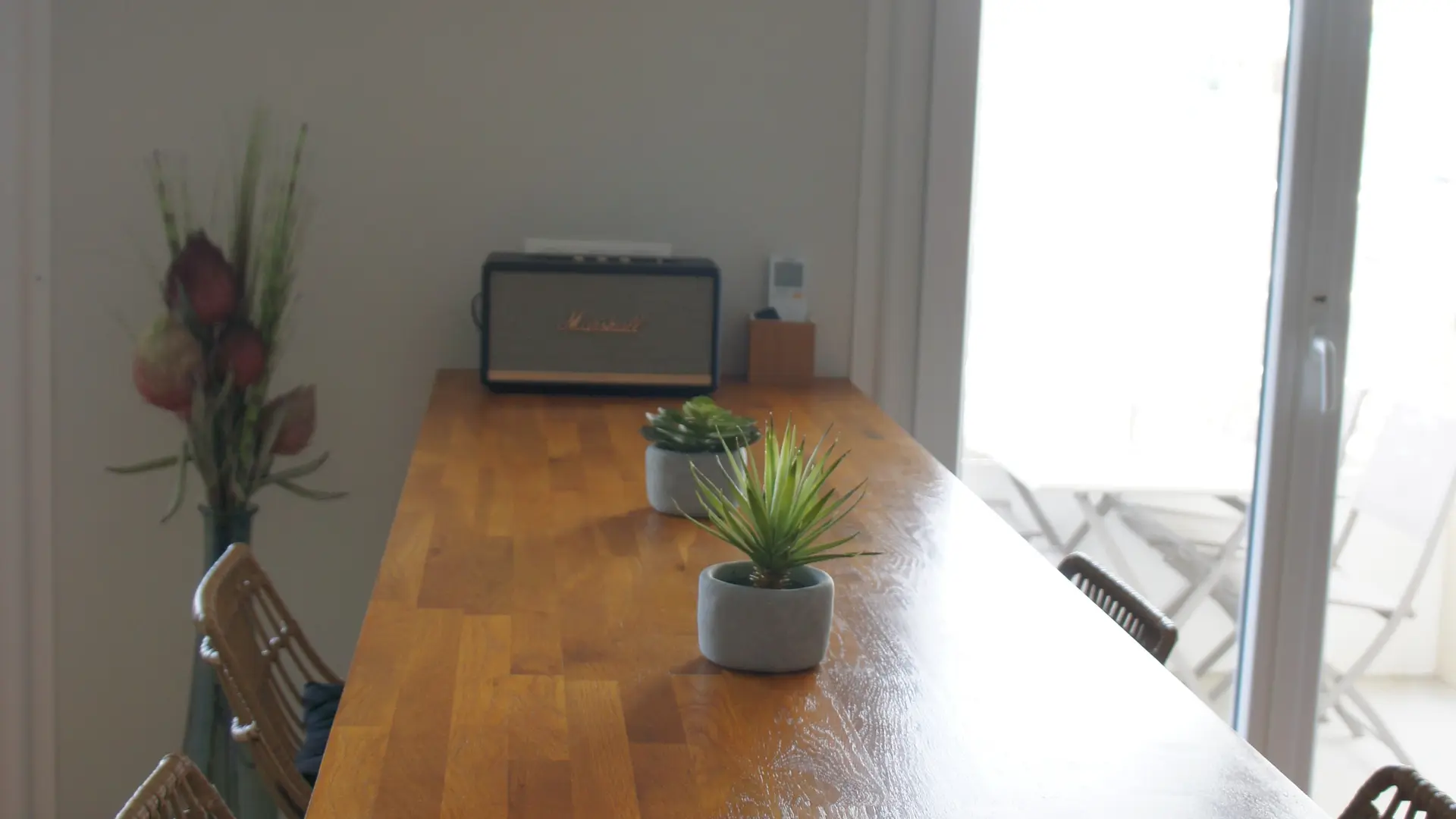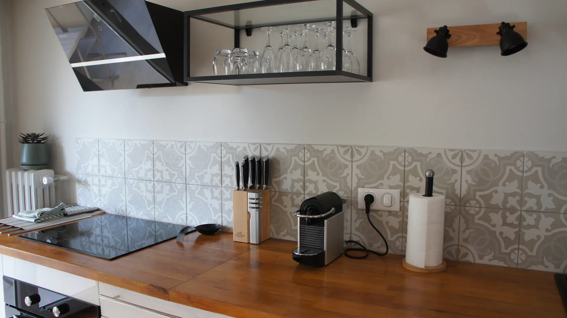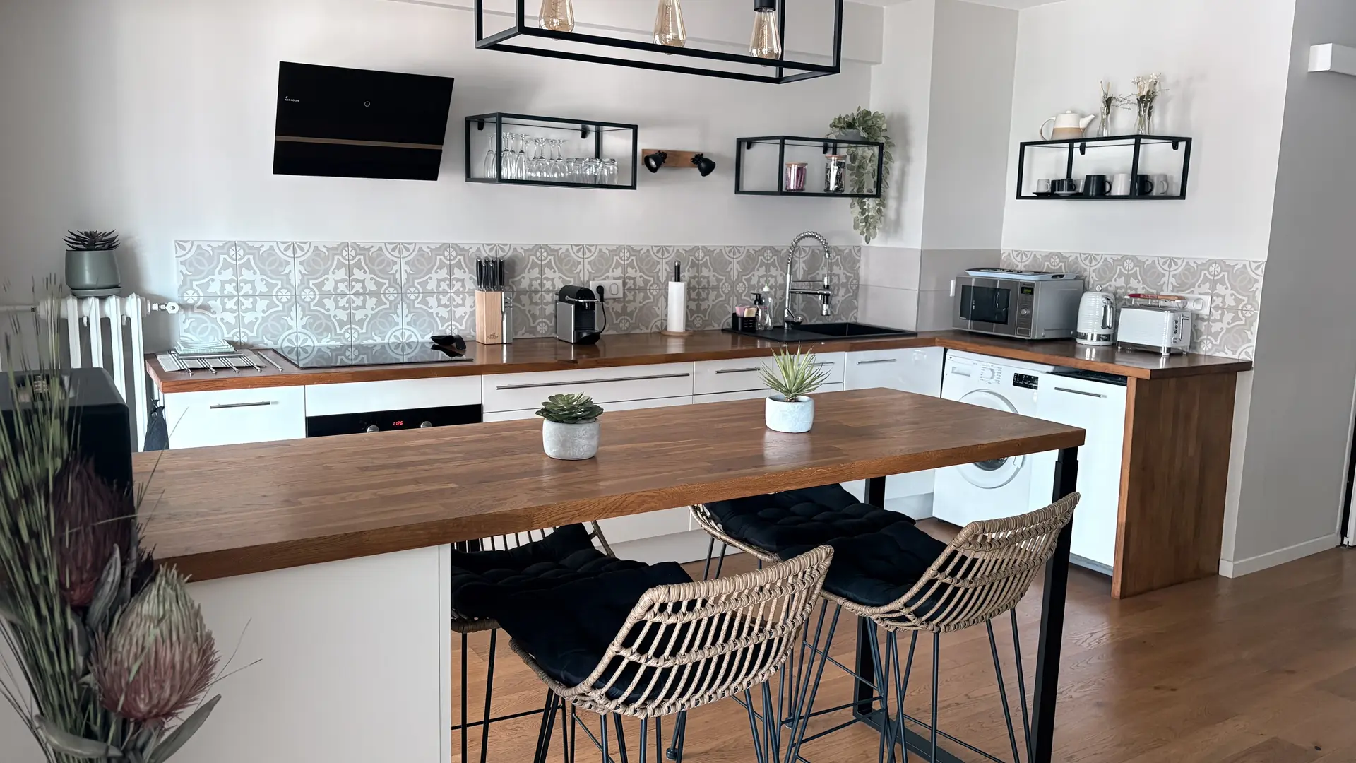 Fully equipped kitchen that opens onto the balcony and lounge with a high bar table and stools for dining or working. Two USB plugs nearby