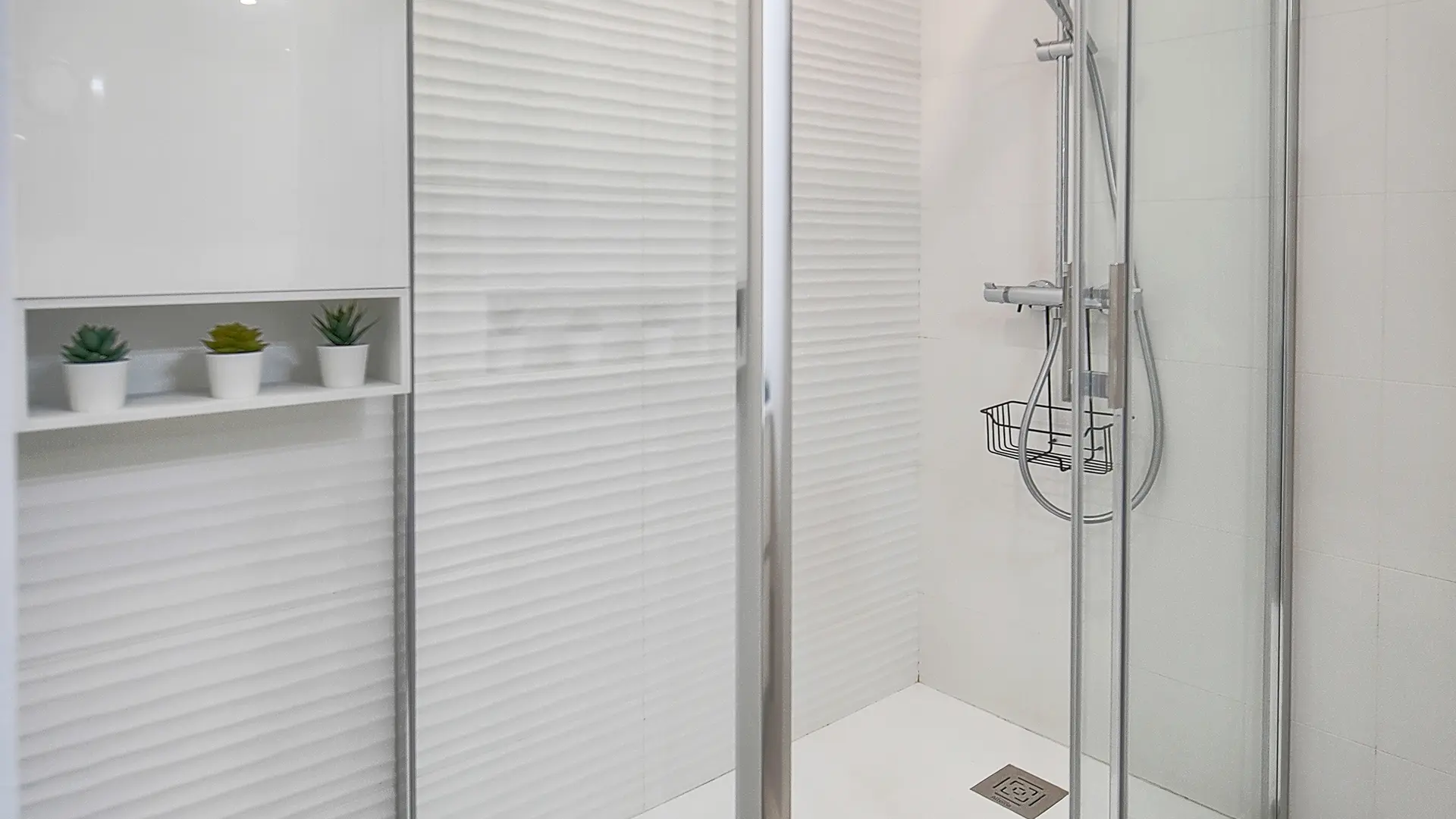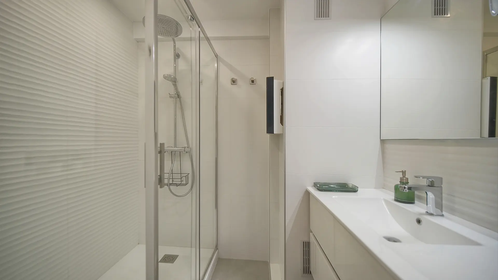 A modern bathroom with rain shower (80 x 120 cm) with high-end fittings.