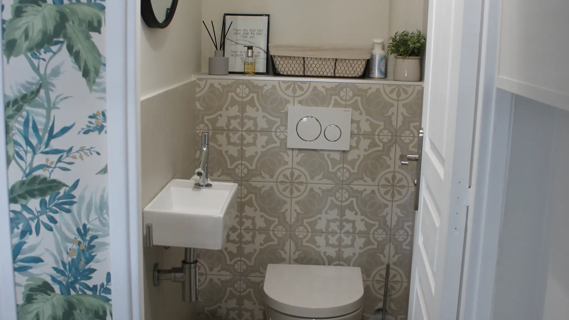 Separate toilets with a wall-hung WC and a hand basin.