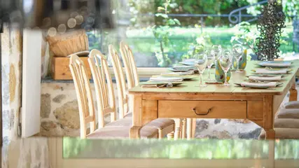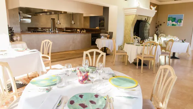 Extend the pleasure of dining at the restaurant, enjoy the park, the tranquility, and the 180-degree panoramic view of the Fayence valley, or sit by the majestic fireplace while watching Chef Quentin at work in his fully open kitchen to the dining room.