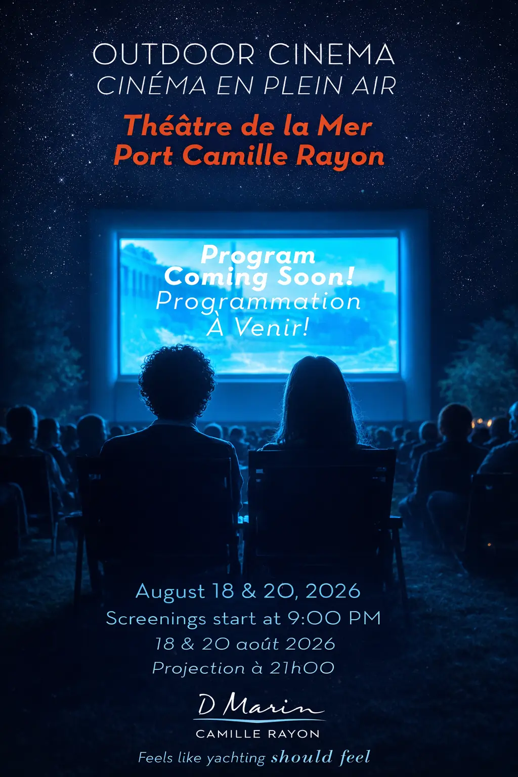 Sit back, relax, and let the magic of cinema unfold under the stars, with family or friends. Enjoy the many restaurants on the port before the screening. Golfe-Juan train station is just a 5-minute walk away.