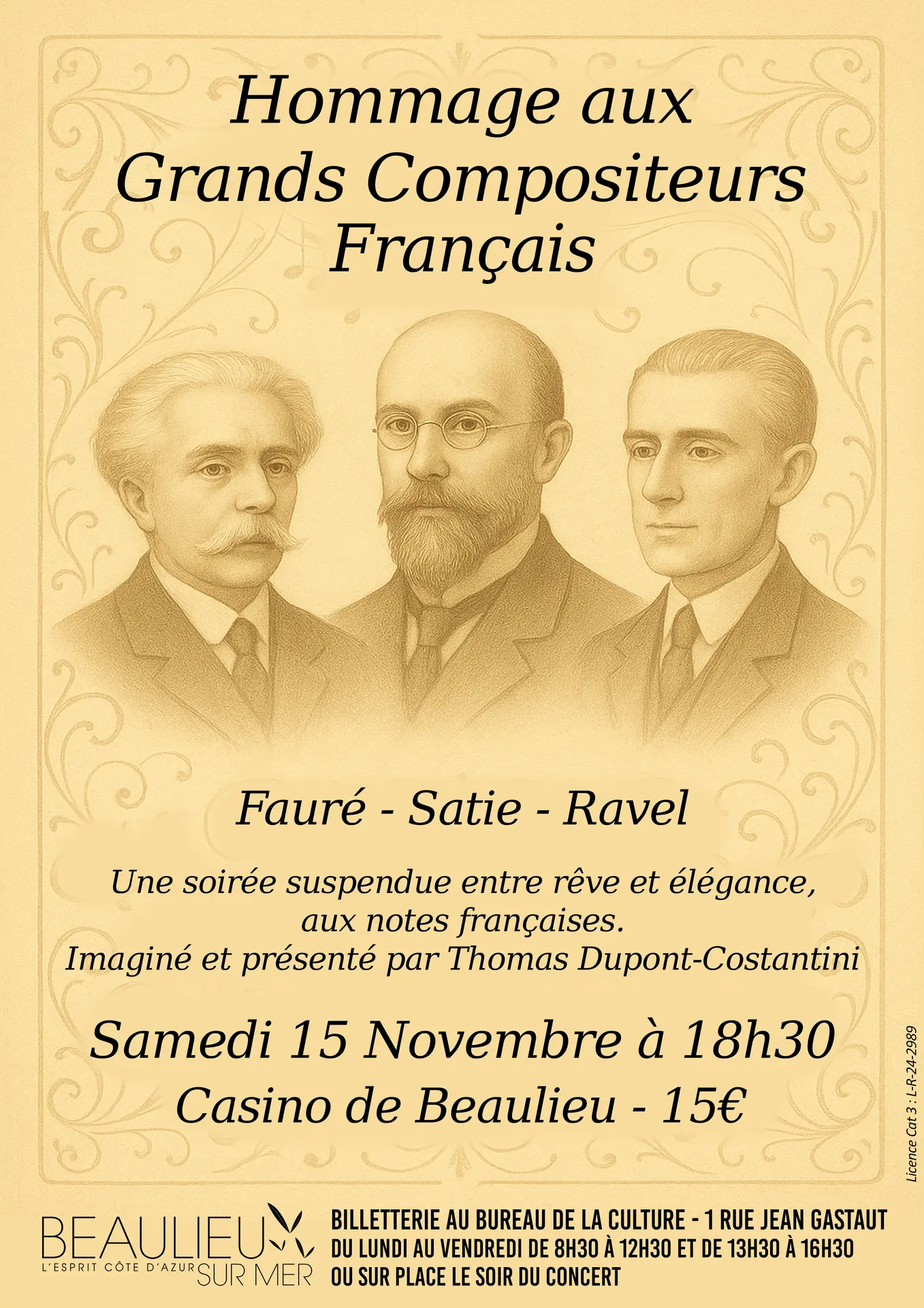 Immerse yourself in the Belle Époque with an exceptional concert dedicated to three masters of French music: Gabriel Fauré, Erik Satie and Maurice Ravel.