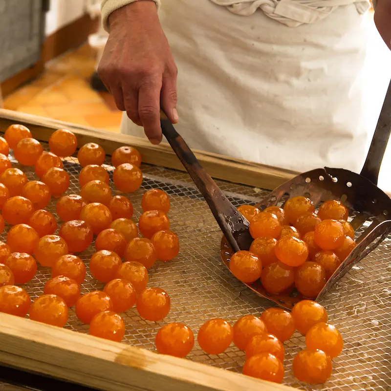 In wintertime, you’ll see us making citrus jams, hand-dipping orange peel into a variety of chocolates, and the glazing process for our candied fruits.