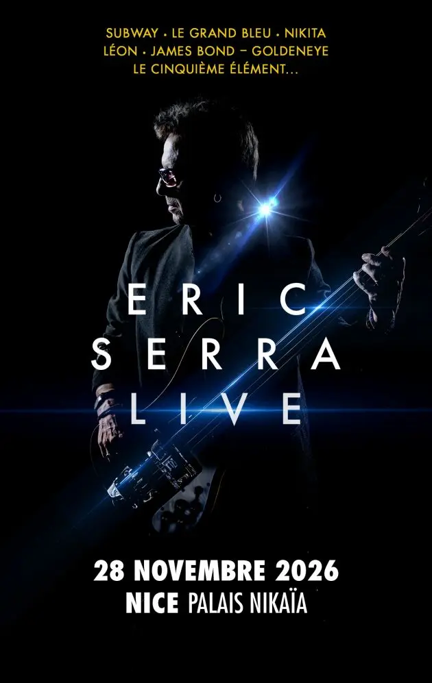 Following the success of his 2023 film-concert tour with The Big Blue, he returns in 2026 to celebrate 45 years of creation with ERIC SERRA LIVE. On stage, he will be by turns bassist, singer, and conductor, surrounded by his loyal musicians. This show revisits his iconic works in a reimagined, immersive, and contemporary version. Audiences are invited to dive into the musical and visual world of ERIC SERRA LIVE, touring throughout France, on December 6, 2026, at the Accor Arena in Paris, and on November 28 at the Palais Nikaïa.