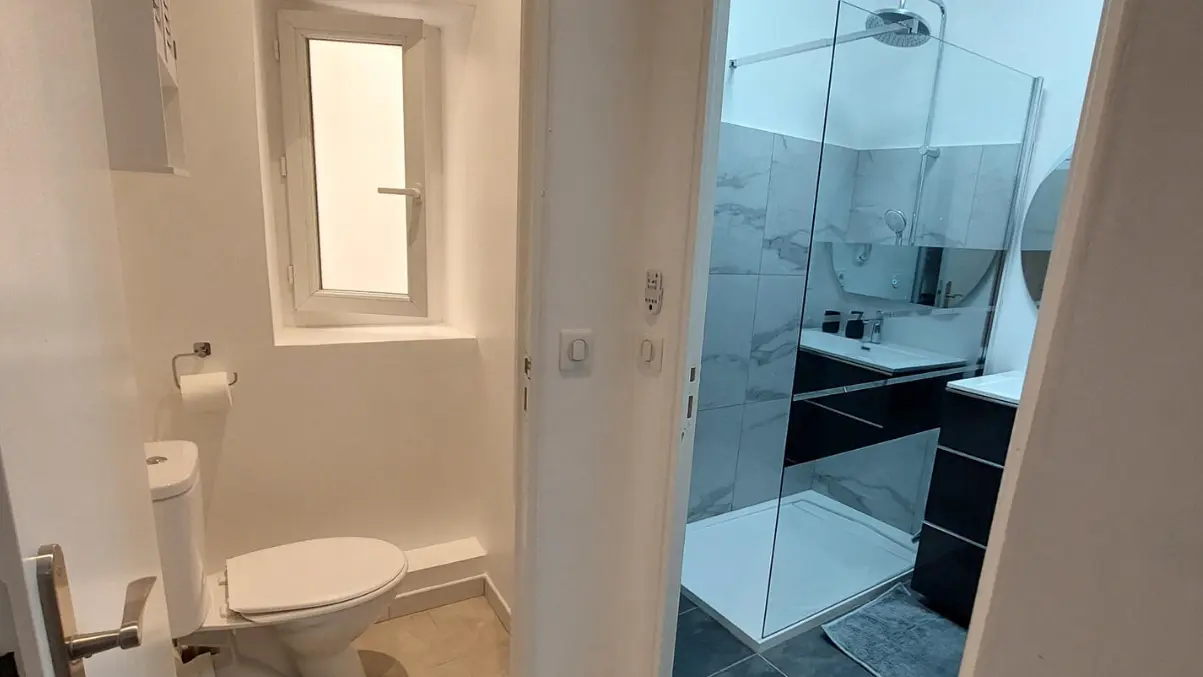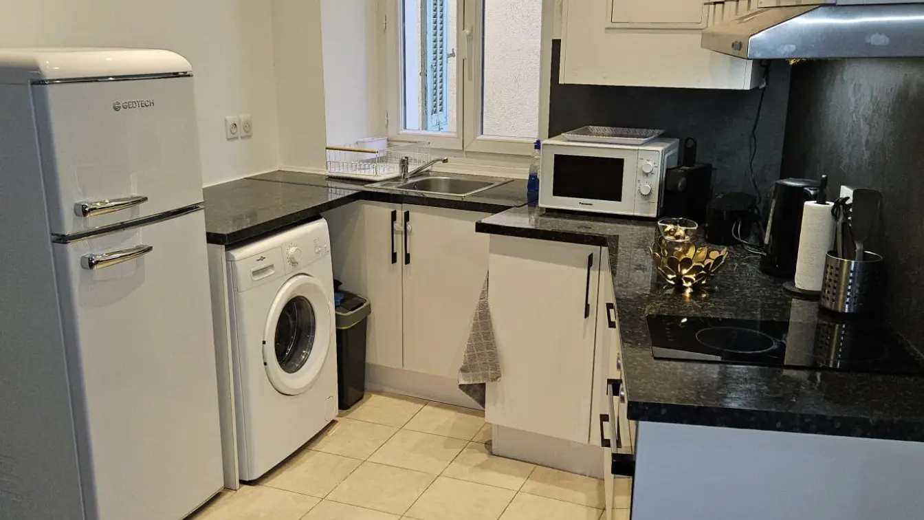 This fully renovated apartment is located on the first floor of a small building. The separate bedroom features a desk and a dressing room. The spacious living room offers a comfortable sofa bed. The kitchenette is fully equipped, should you decide not to explore the many restaurants nearby. The bathroom has a large walk-in shower. The toilet is separate. Two new air conditioners will ensure your comfort.