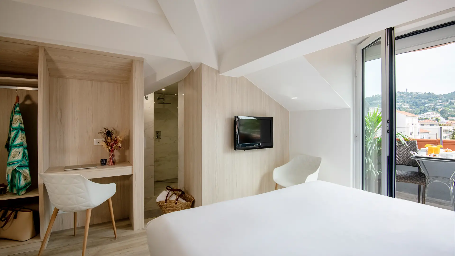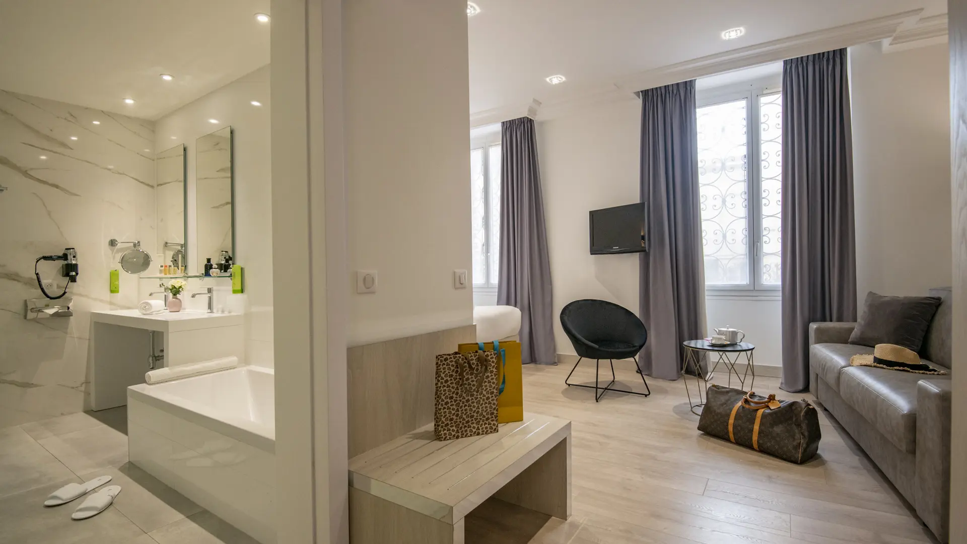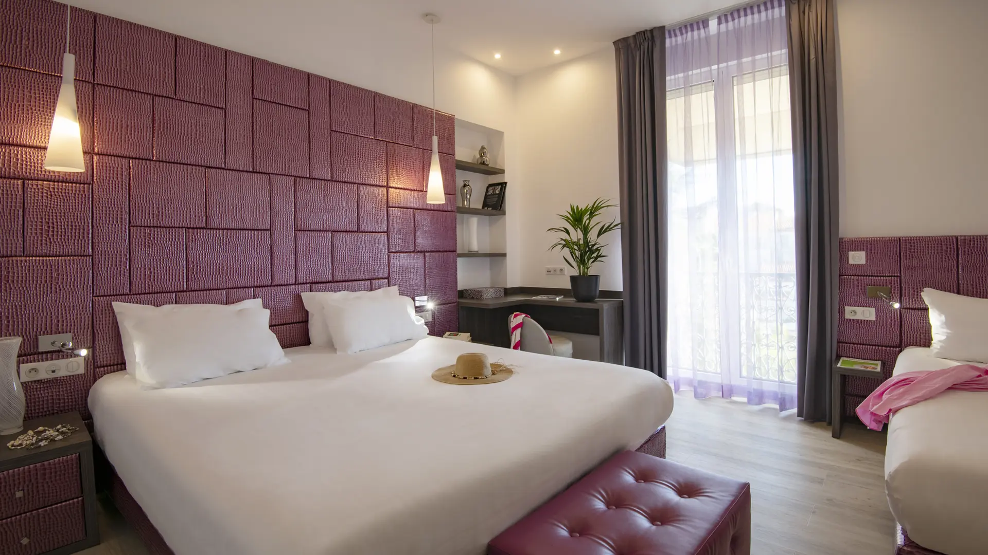 The Hotel de Paris Cannes will welcome you in a modern decor combined with old stones, in the heart of the city of Cannes, a 7 minute walk away from the private beaches of the famous Croisette. You will appreciate its large swimming pool of granit nestled in the heart of a luxuriant garden with Italian essences, the speed of the fiber optic Wifi network, its bar open 24 hours on 24 and its parking and closed and secured garage, with valet Service. The entire hotel team is at your disposal to ensure a successful stay. We guarantee the best price. Call us at the hotel!