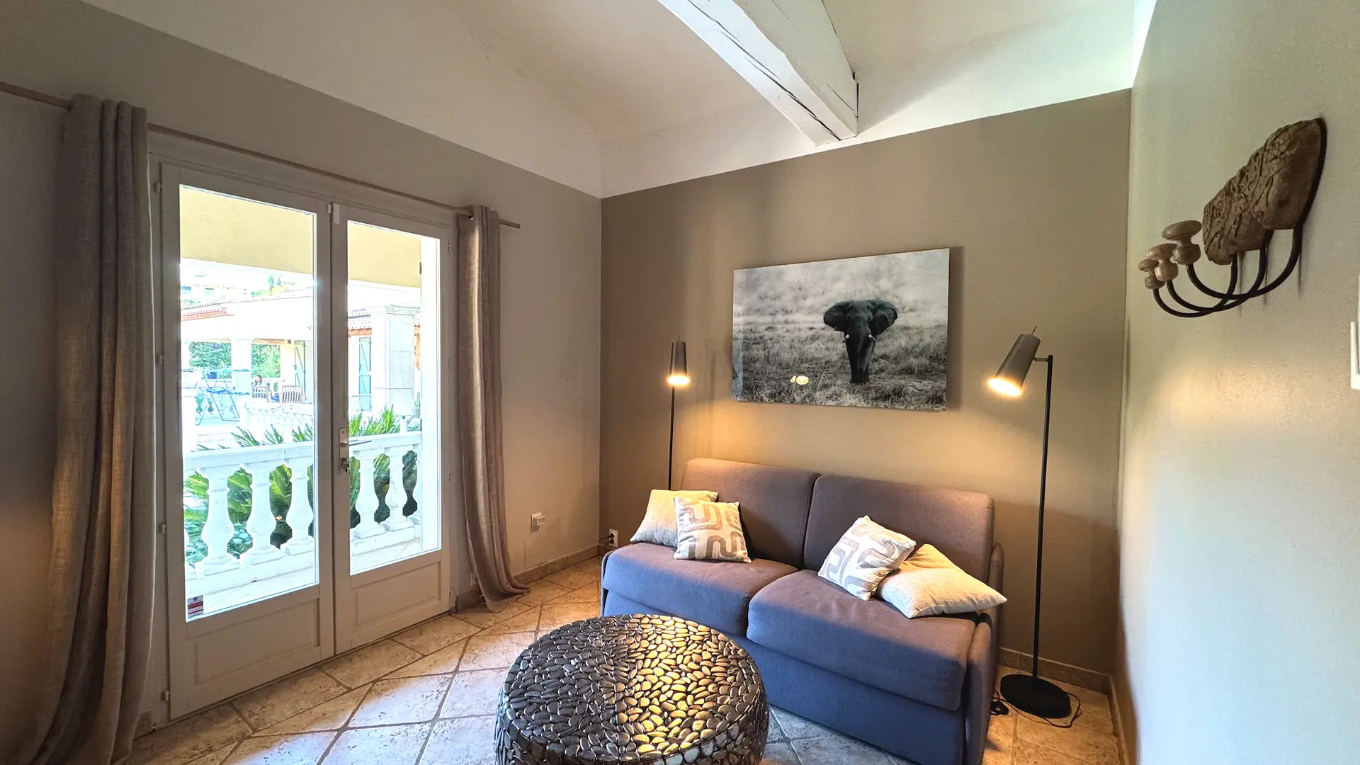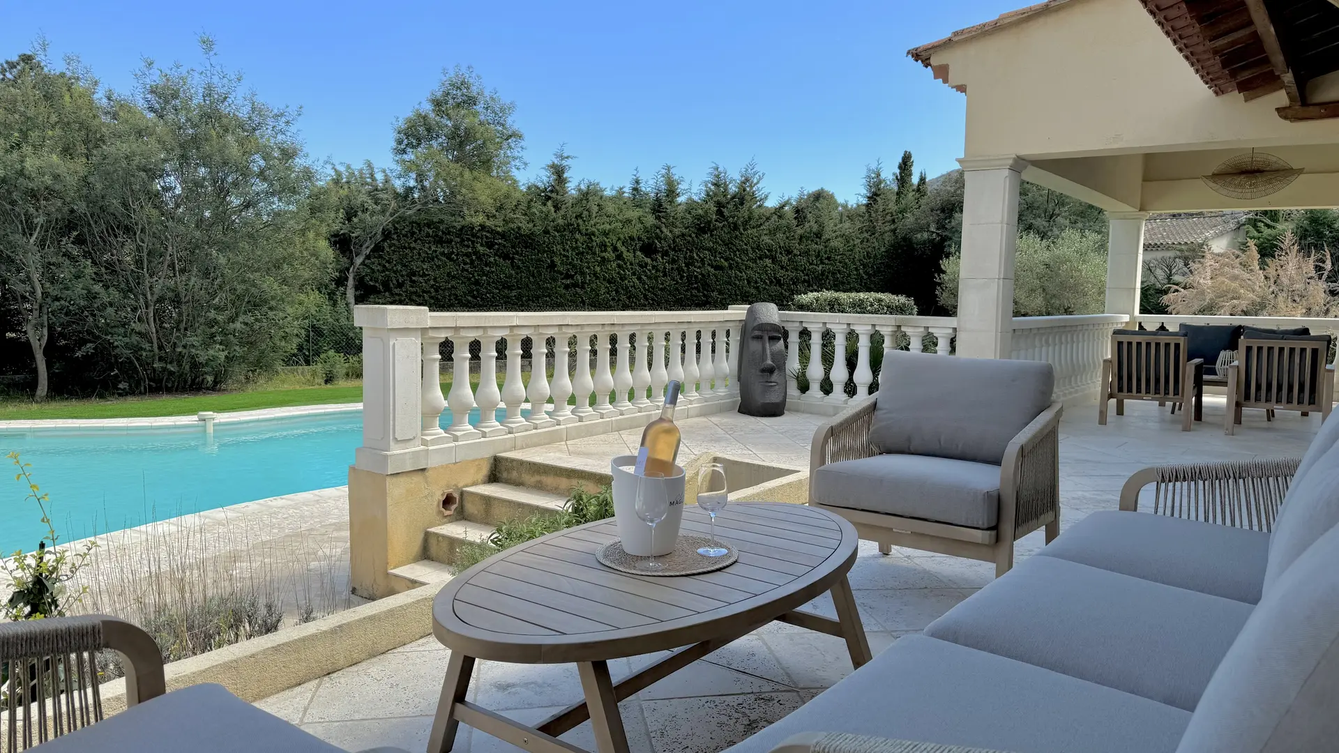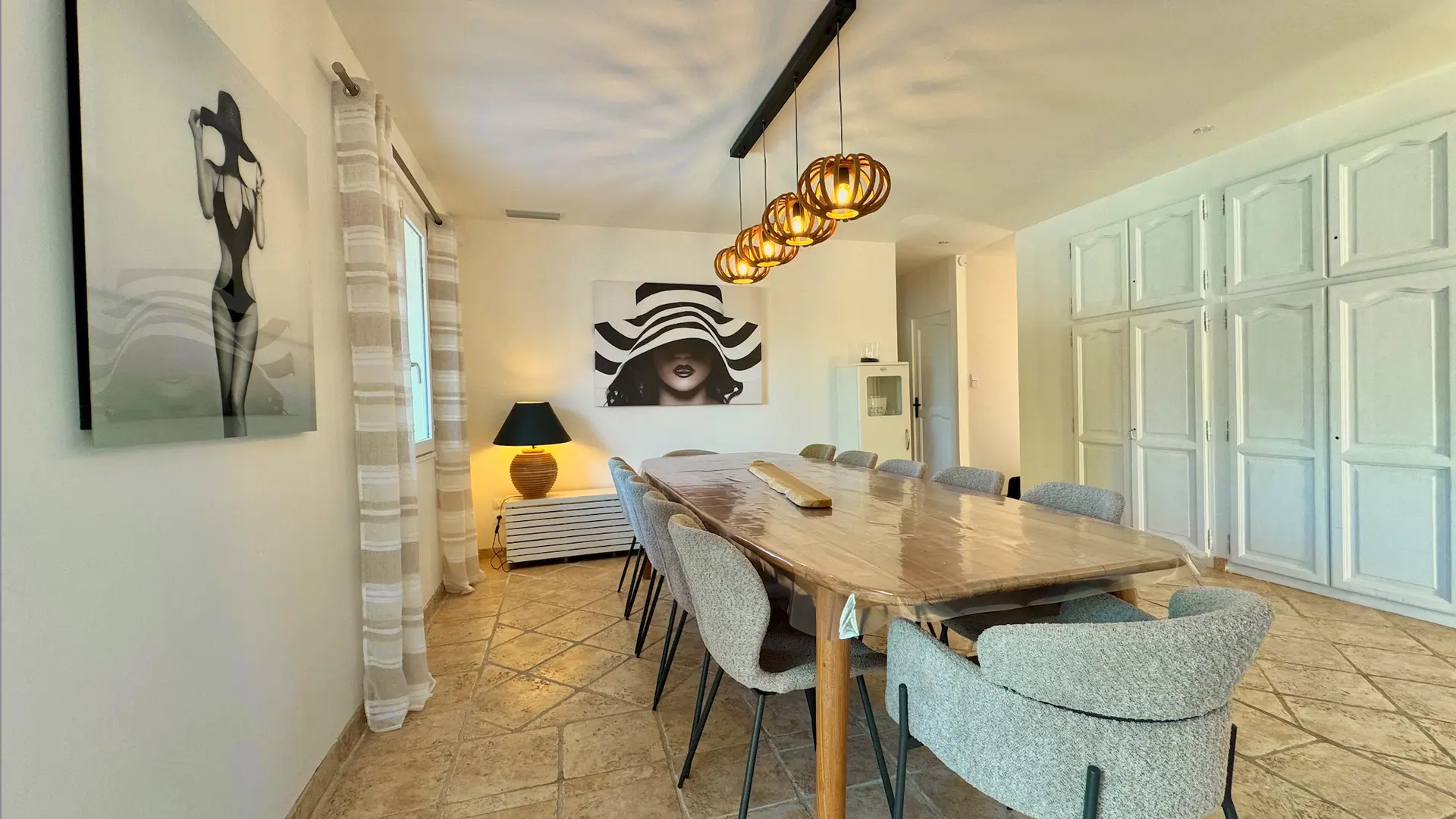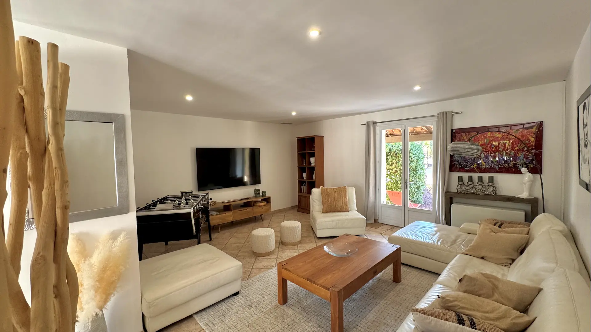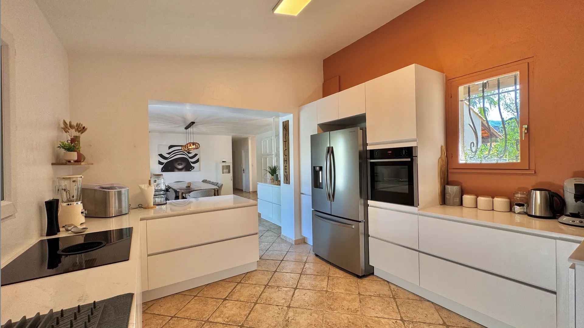 On one level and fully air-conditioned, the villa comprises: • Spacious and bright living space: a fully equipped open-plan kitchen (American-style refrigerator, oven, microwave, dishwasher, ice maker, etc.), a pantry (washing machine and refrigerator/freezer), dining room, and living room. • 5 bedrooms, 1 office, and 3 bathrooms: