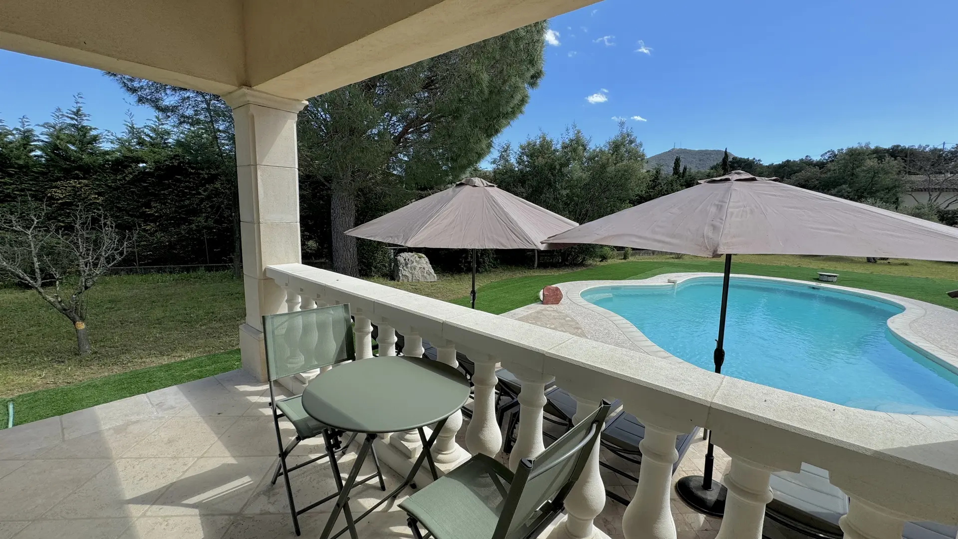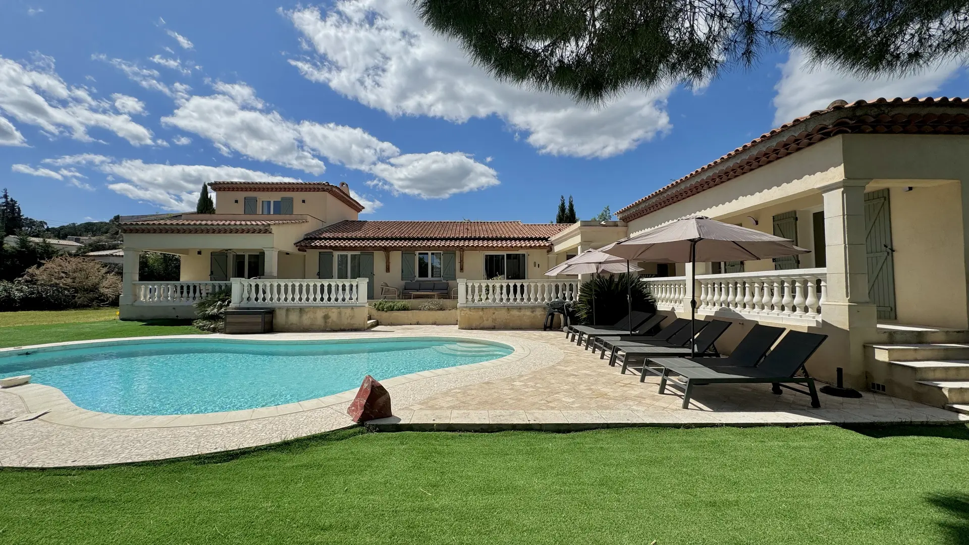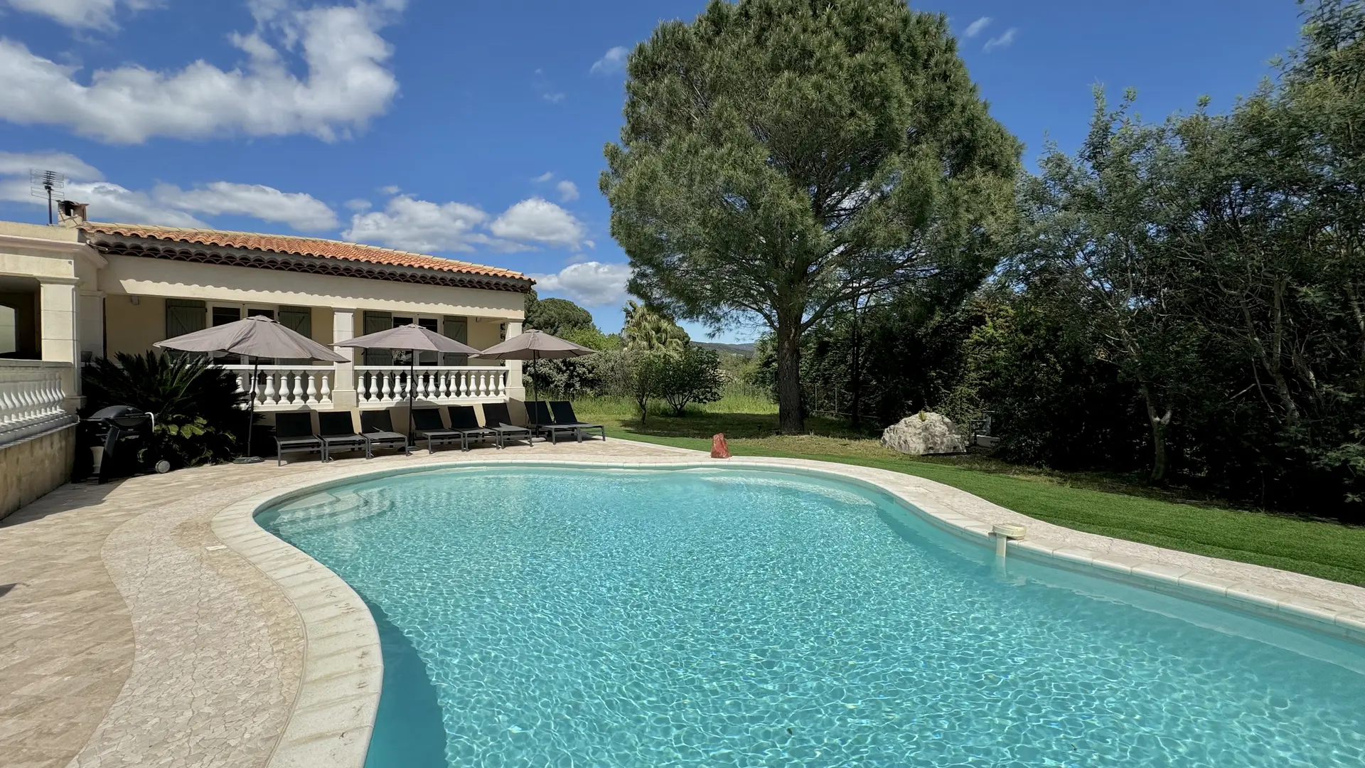 Spacious exterior featuring a dining area with a summer kitchen (sink, griddle, hotplates), a large table that seats 12, and a magnificent free-form heated* swimming pool (11x5 m) surrounded by a terrace with 8 sun loungers and parasols.