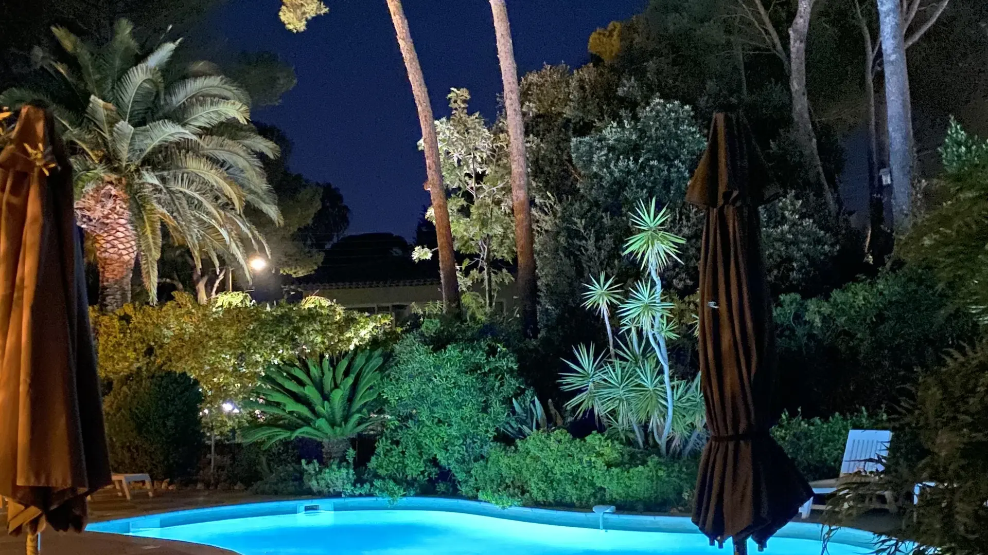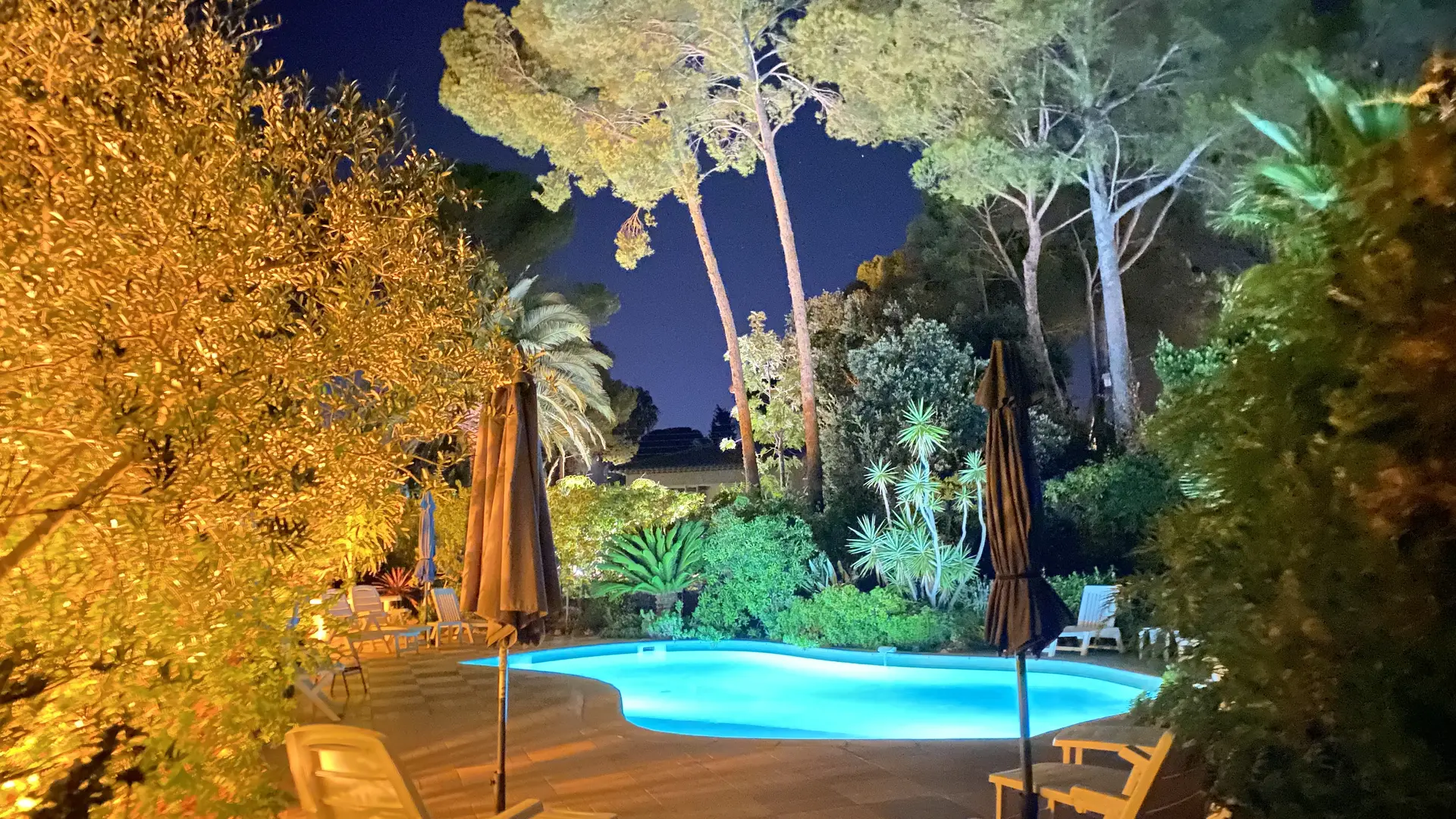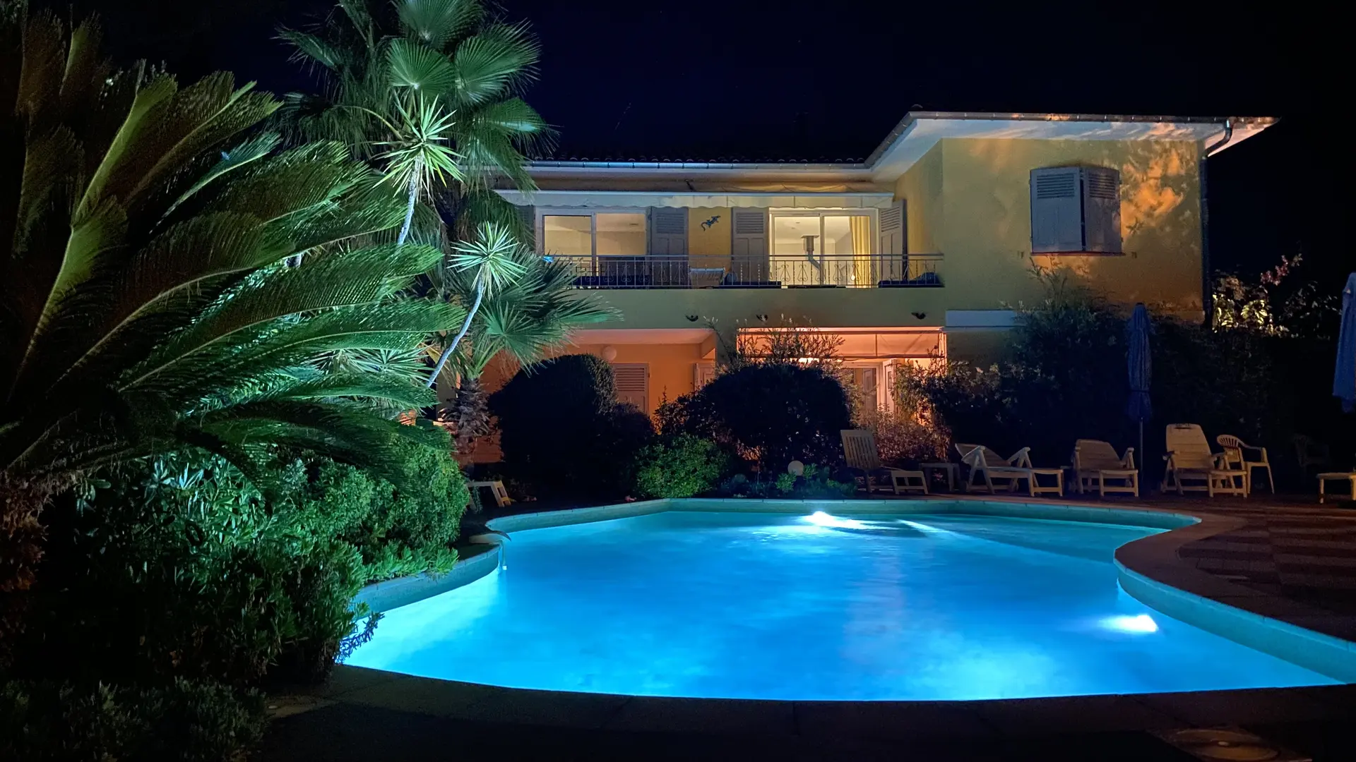Pool equipped with an audible alarm that is floodlit in the early evening