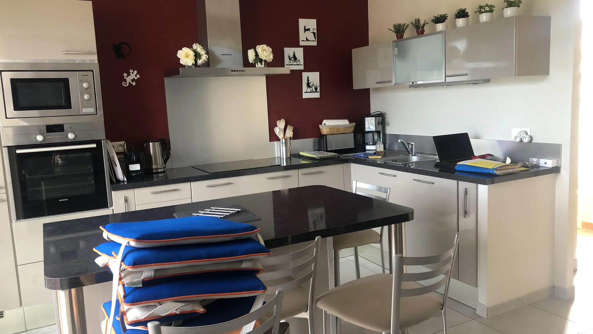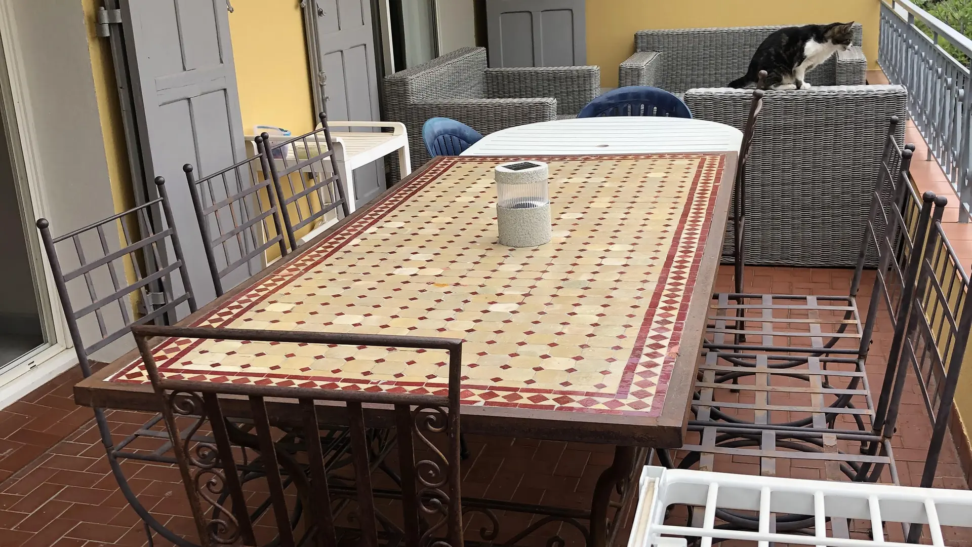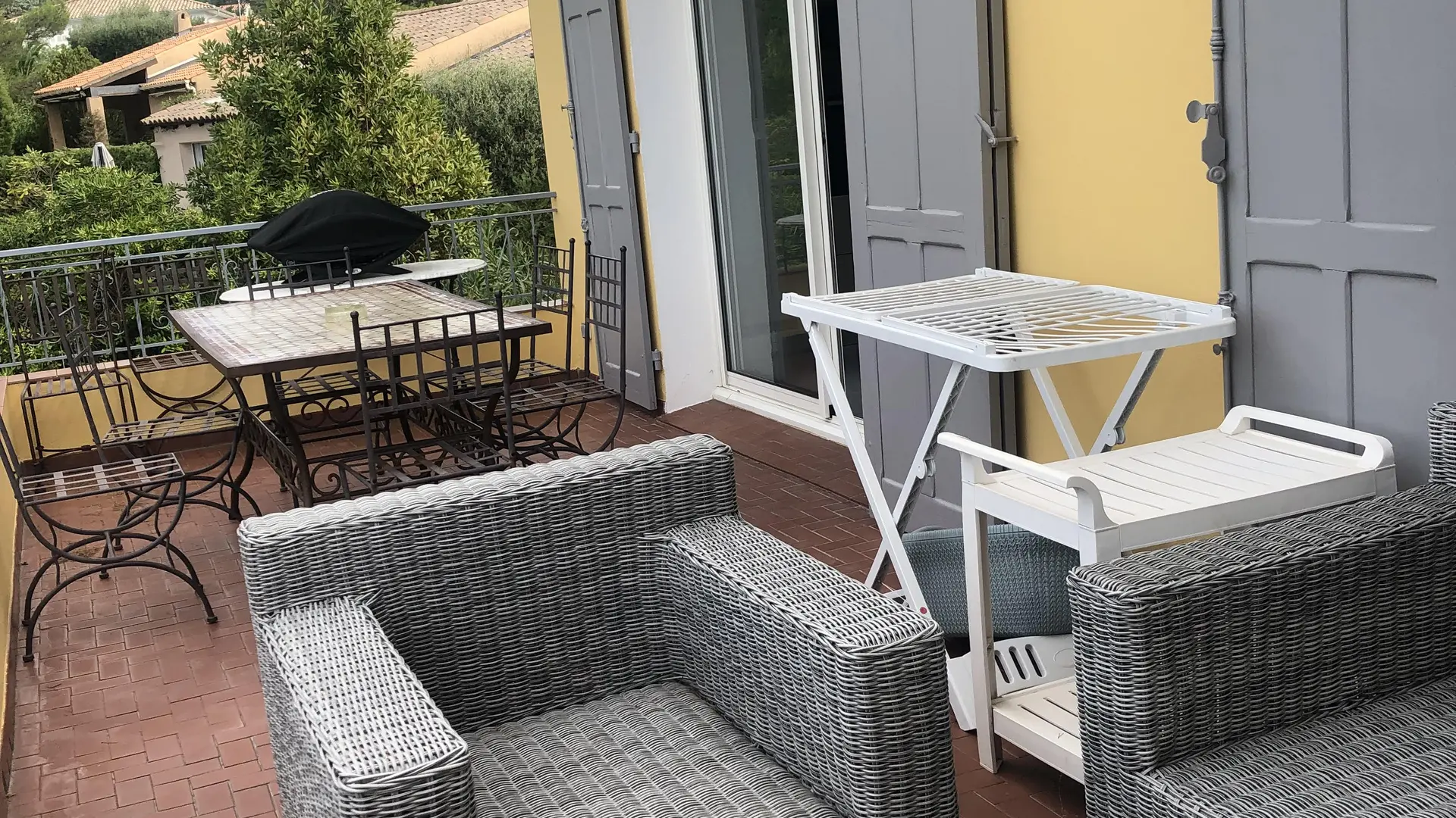South-facing terrace of approx. 25m2 with sitting area and dining area (table for 6-8 people), as well as an electric Weber barbecue, and protected by an awning.