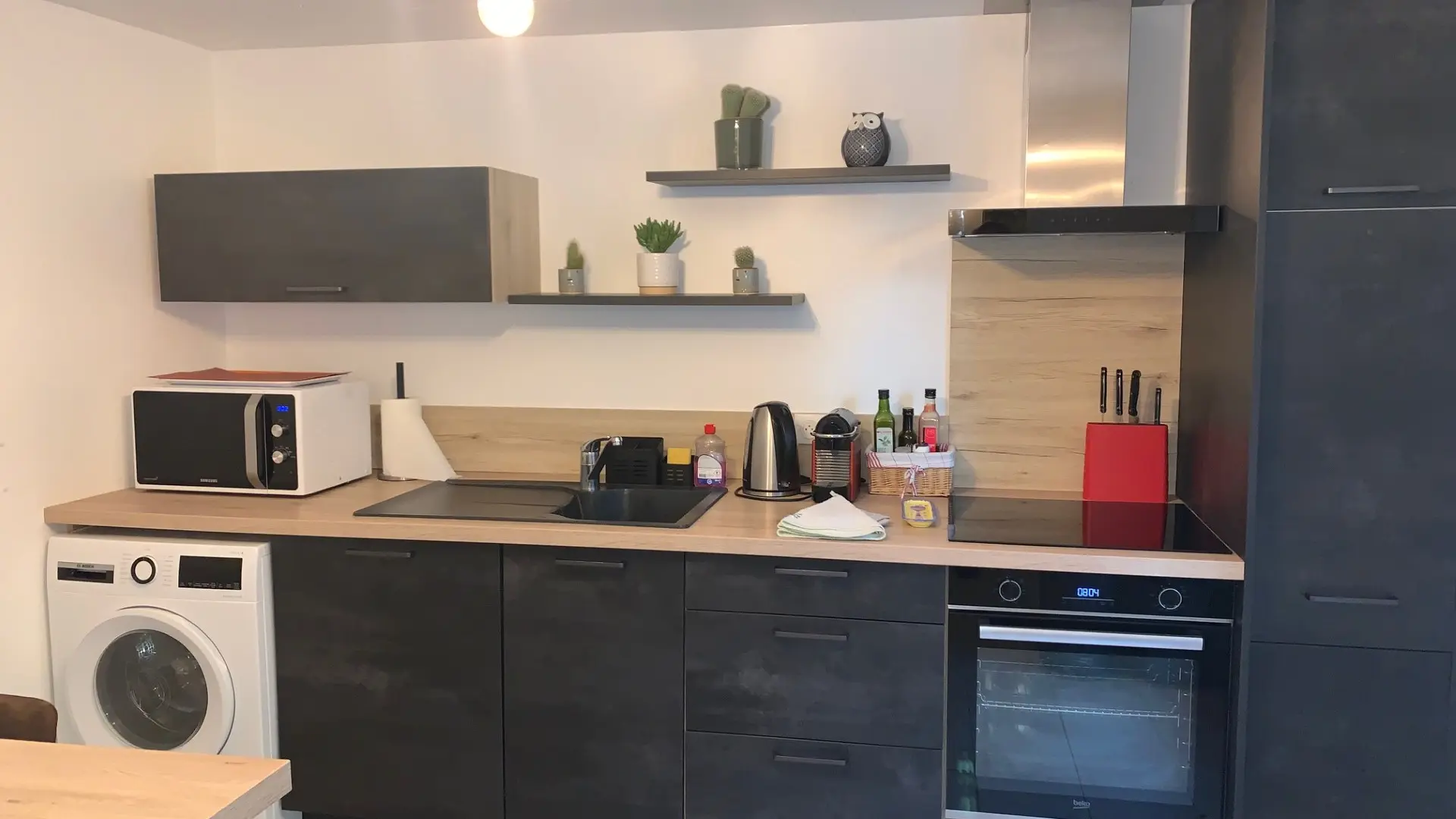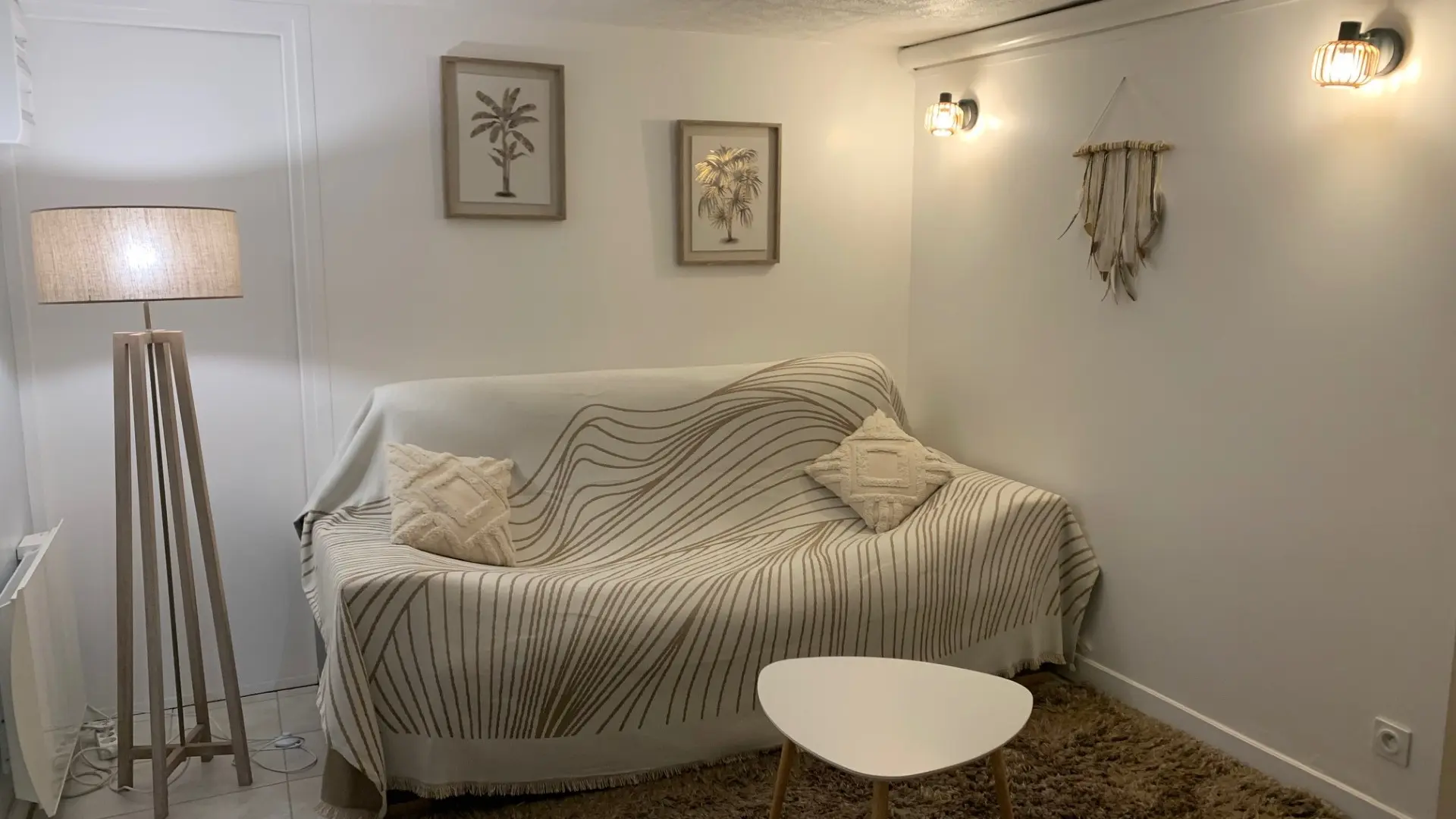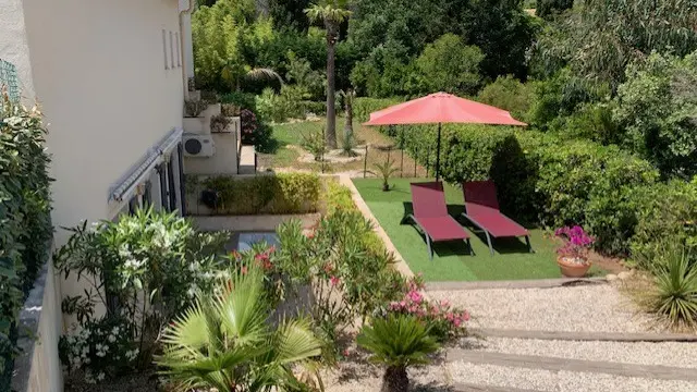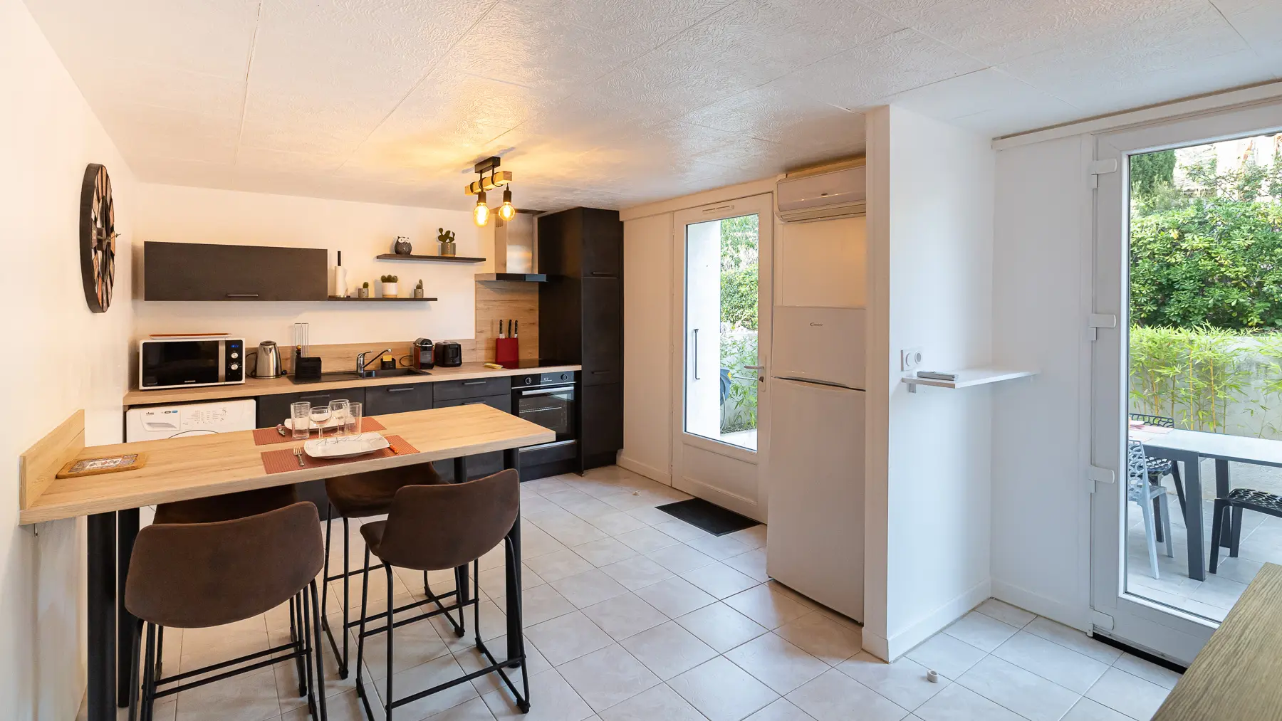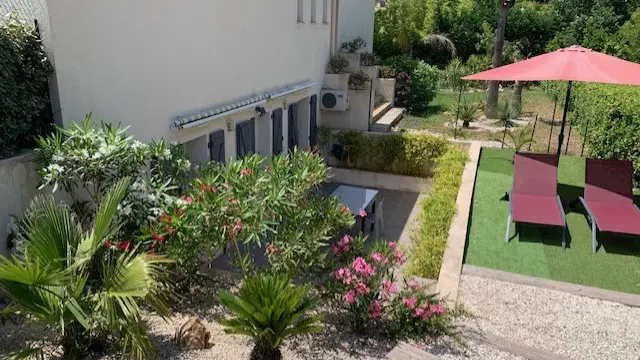 T2 ground-floor villa, 3-star rating, with separate entrance, terrace, garden with two deckchairs and garden furniture, fitted kitchen: washing machine, dishwasher, living room with large screen, free wifi, air-conditioning, shower room, bedroom with 160cm bed.