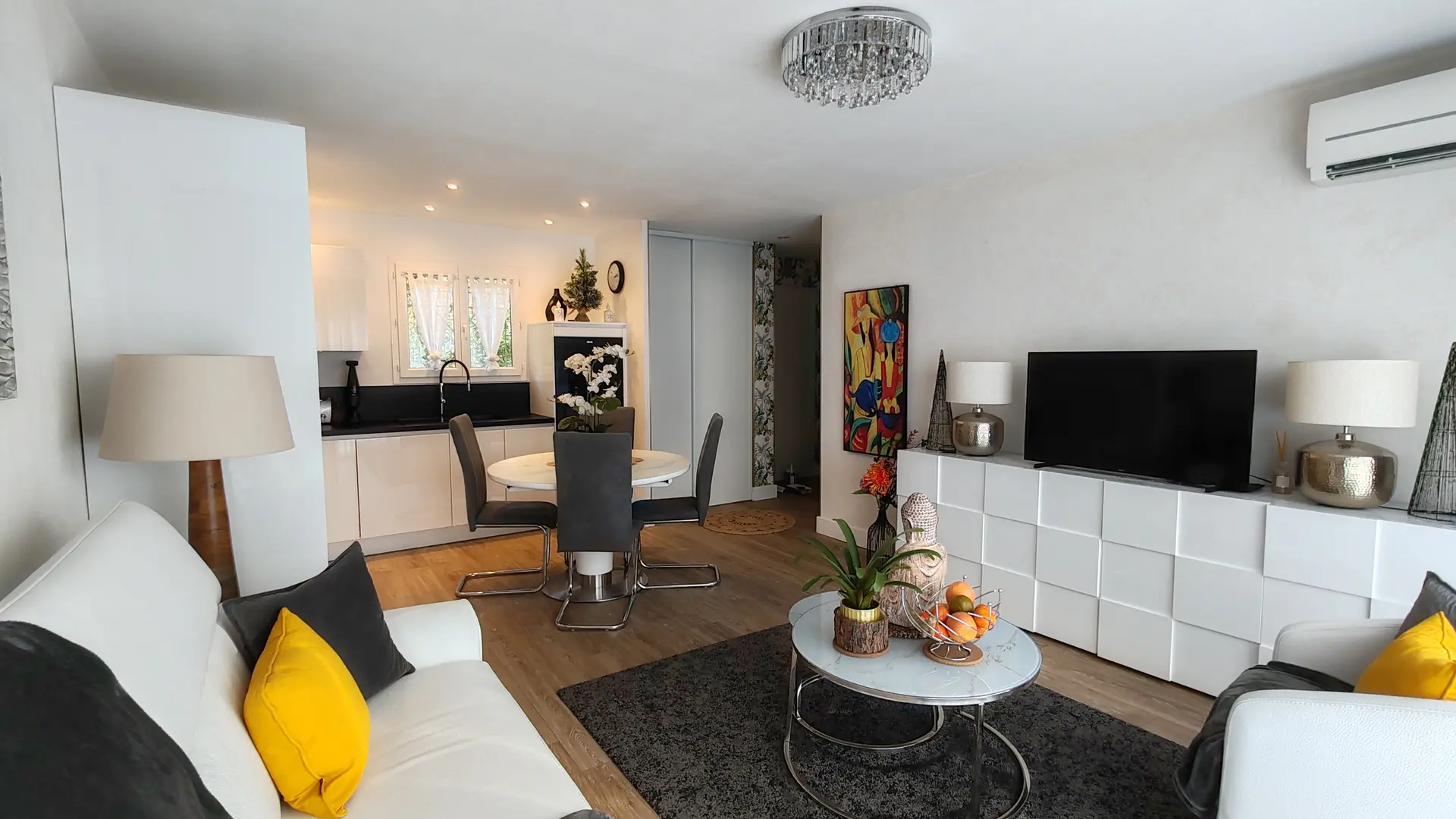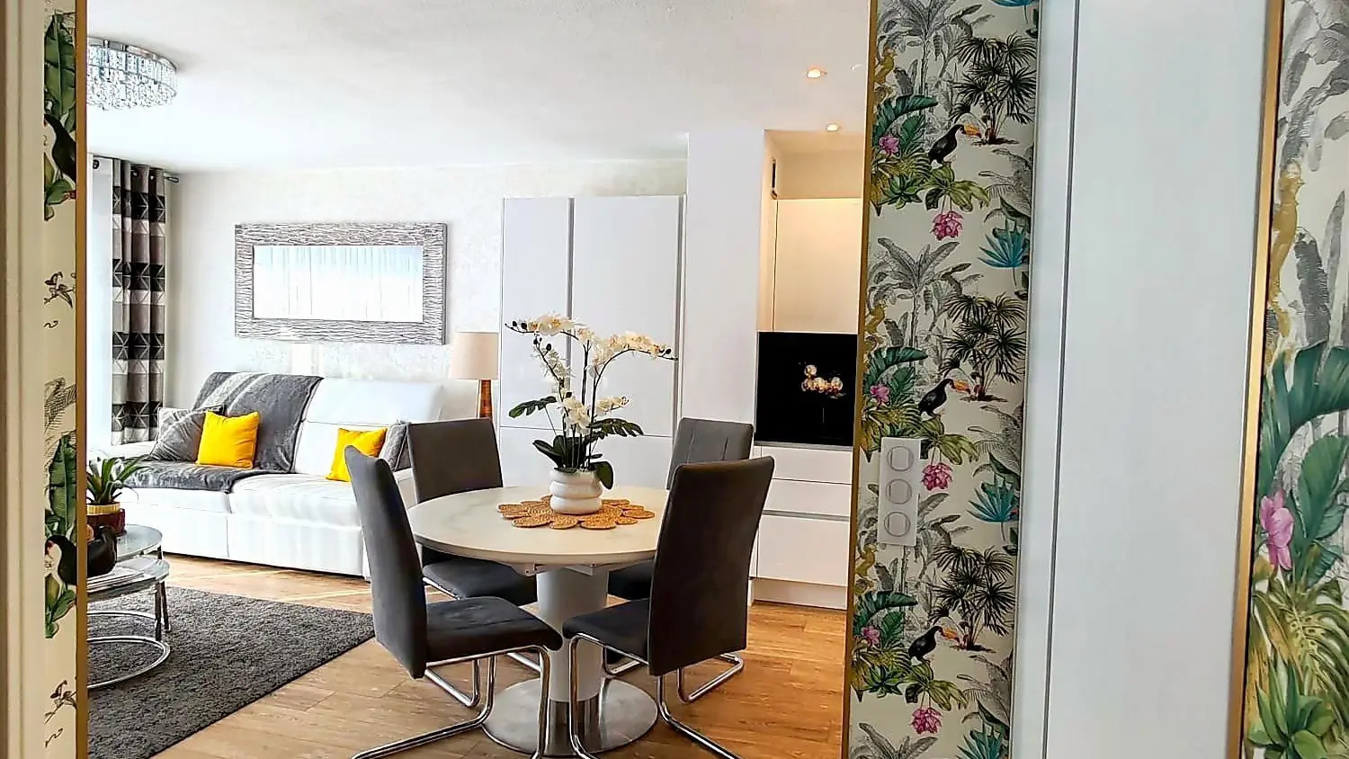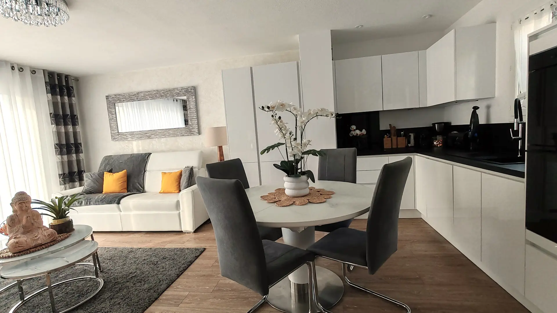 The light-filled living room offers a welcoming space with a convertible leather sofa, an armchair, a large designer sideboard, a flat-screen TV, free Wi-Fi, fiber optic internet, and a pleasant dining area where you can enjoy your favorite dishes.