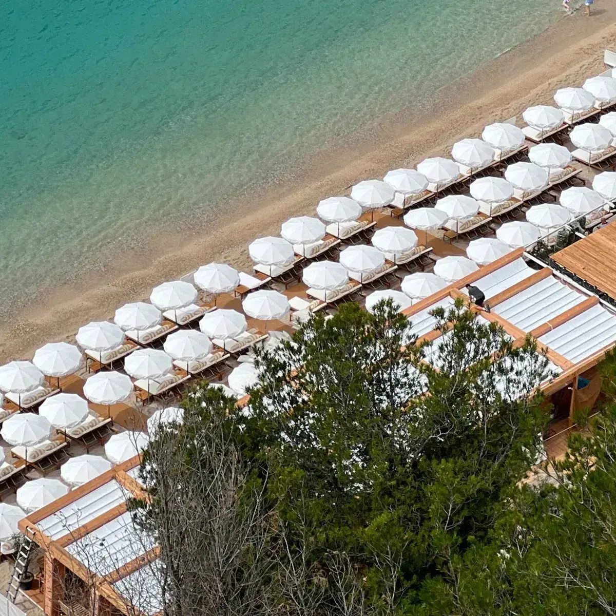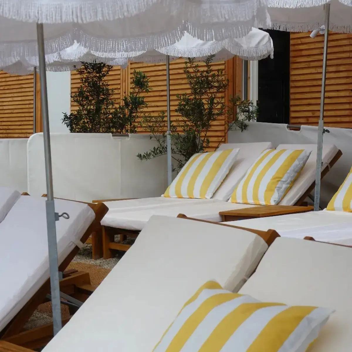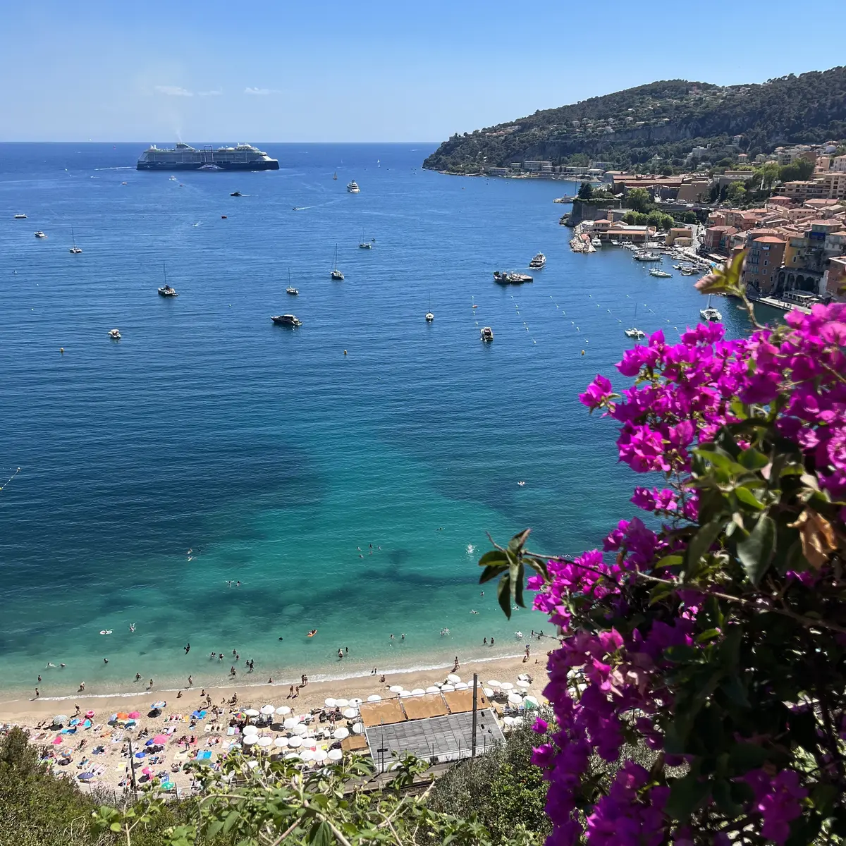 A sun-drenched interlude with yellow and white stripes, nestled on the sand in the heart of Villefranche Bay.