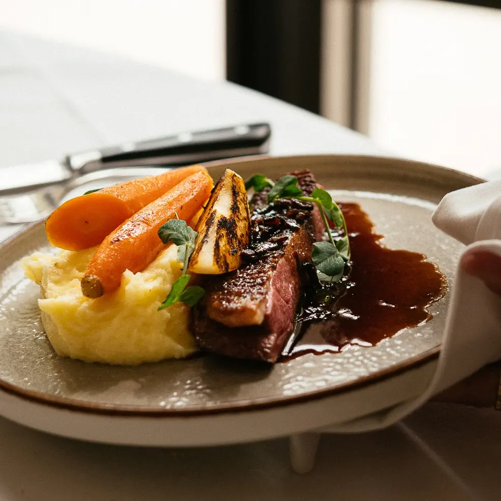 The restaurant and its intimate setting invite you to savor dishes paired with vegetables from the garden. The team strives to create generous, gourmet, simple, and authentic cuisine, and the carefully curated menu evolves with the seasons.