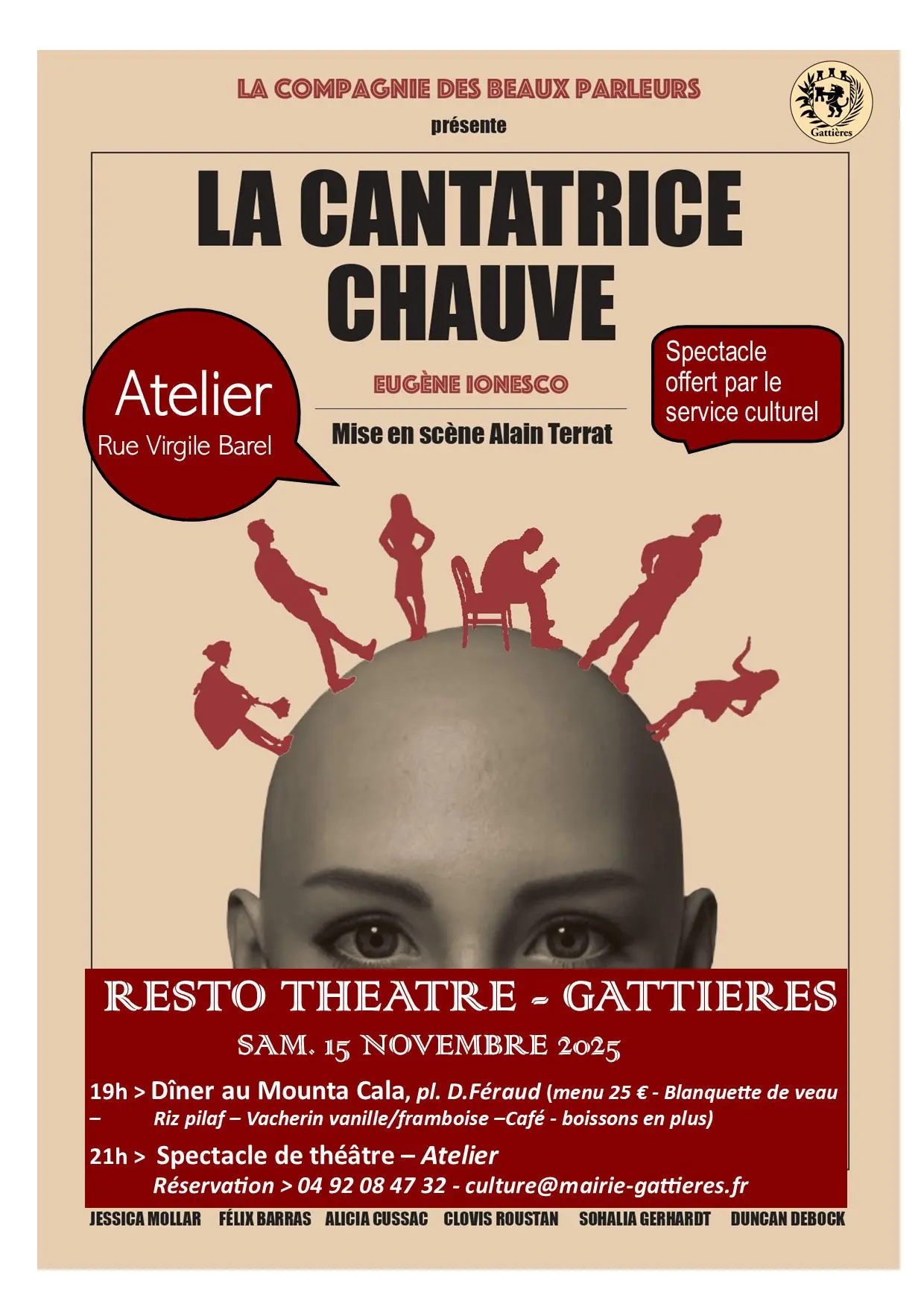 The cultural department of Gattières invites you to an evening of dinner and theater. Join us at the Mounta Cala restaurant for dinner (veal stew with rice pilaf and vacherin cheese) followed by a performance at the L'Atelier theater.