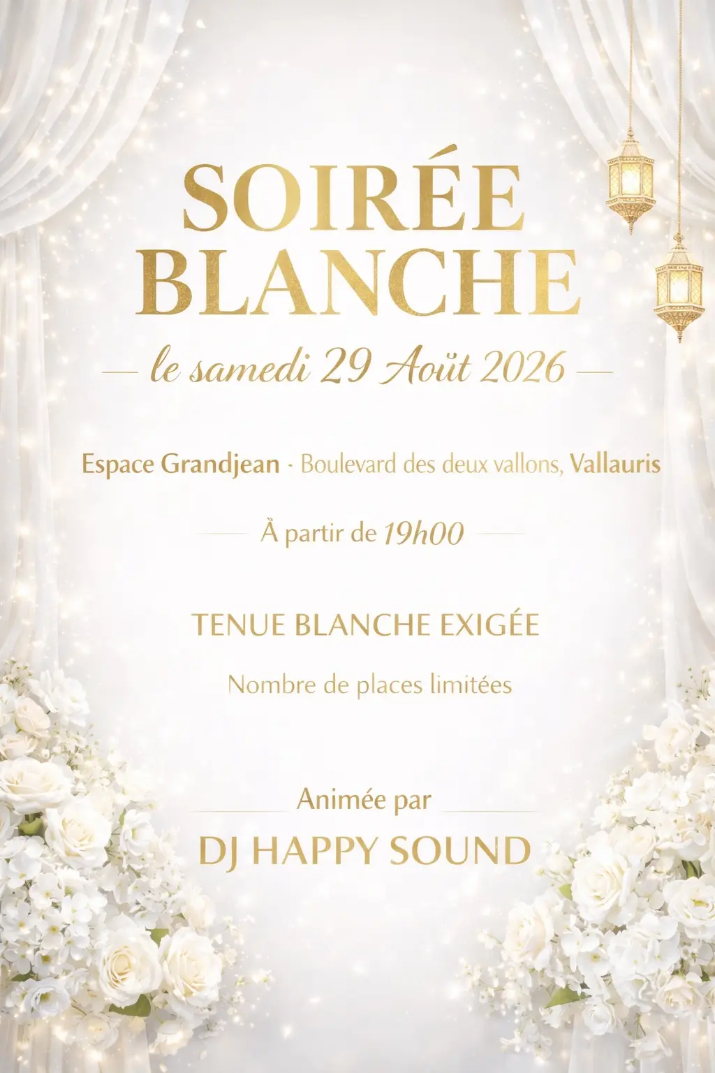 The Soirée Blanche, end-of-season event, will take place on August 29 from 7pm at Espace Grandjean: reservation required (limited spots from early August), with bar, food, night market, DJ Happy Sound and Miss Vallauris. White attire required.