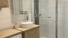 New bathroom (shower in 160), WC and washing machine, ironing board and iron.