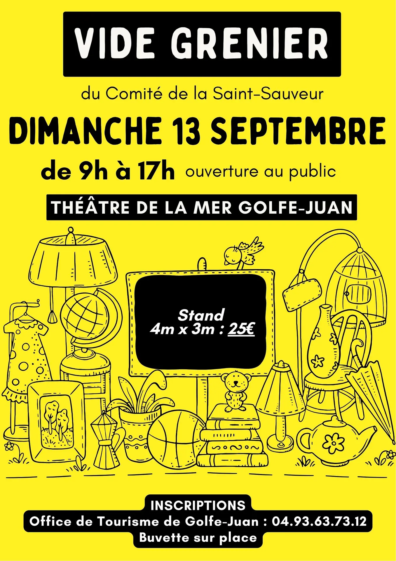 Large flea market organized by the Saint-Sauveur Committee at the Théâtre de la Mer in Golfe-Juan. Join us on Sunday, September 13, from 9 a.m. to 5 p.m. to browse, sell, and enjoy a friendly day out. Booths available (4m x 3m) and refreshments on site.