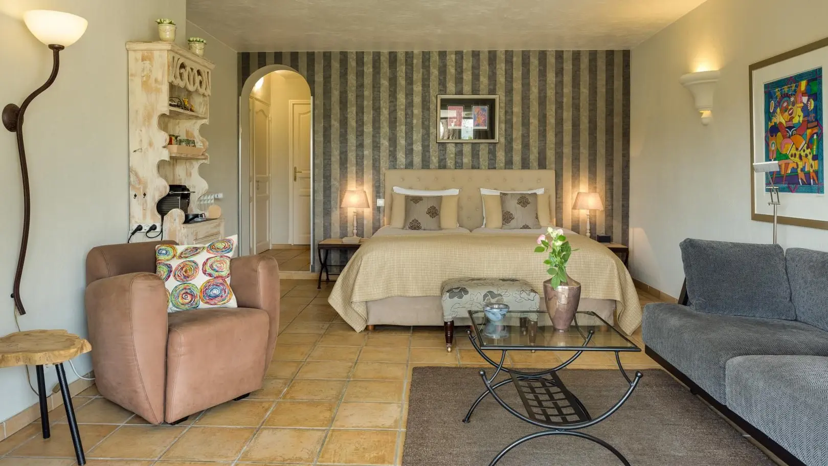 Bdrm "Ivoire" (2 90cm sgl beds to form a 180cm db bed), lounge area, bathroom (bathtub & shower) with wc. Bdrm "Verte" (2 90cm sgl beds to form a 180cm db bed), washroom with wc. Bdrm "Rouge" (1 160cm db bed.), washroom with wc. TV, DVD, mini-bar, refreshment tray, Wifi, safe.